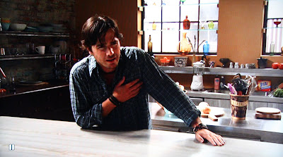I love this loft. What fun place to grow up in. This loft has everything from the stained glass doors and garage door room separators to built in brick bookshelves and a cute dining banquette. I think my favorite thing in the house aside from Dan's book alcove are the beautiful wood apothecary drawers that make up one side of the kitchen. If I didn't have a white kitchen with subway tile, this would be my next choice. It's weird you never see their dad's room...ever...